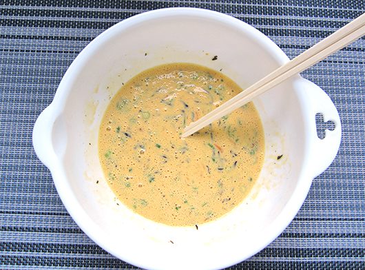 - 3. 卵焼器に油をひき、2~3回に分けて流し込み巻いていきます。